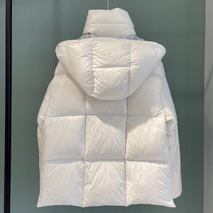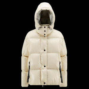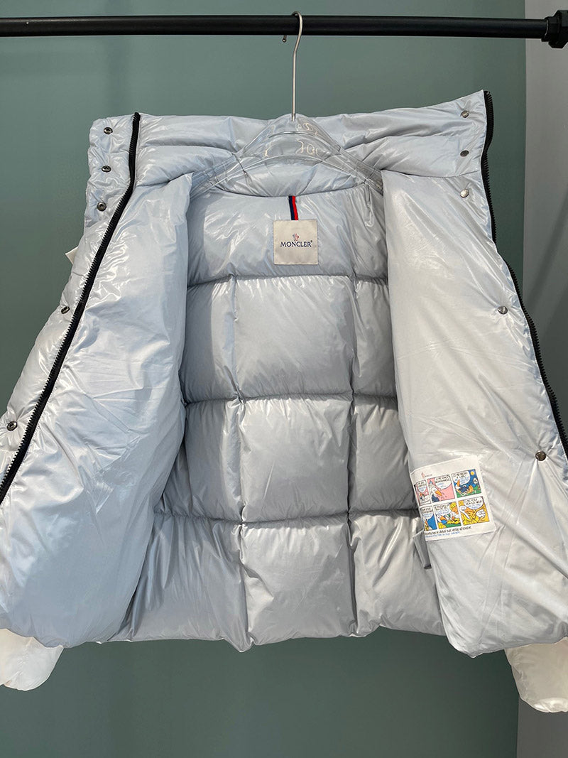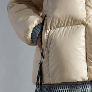 This Parana down jacket is characterized by its precious shiny nylon laqué texture with vibrant contrasting colors between the interior and exterior. The short puffer's hood can be detached when the weather permits, while the oversized zipper pulls with Moncler lettering are inspired by the logomania trend.